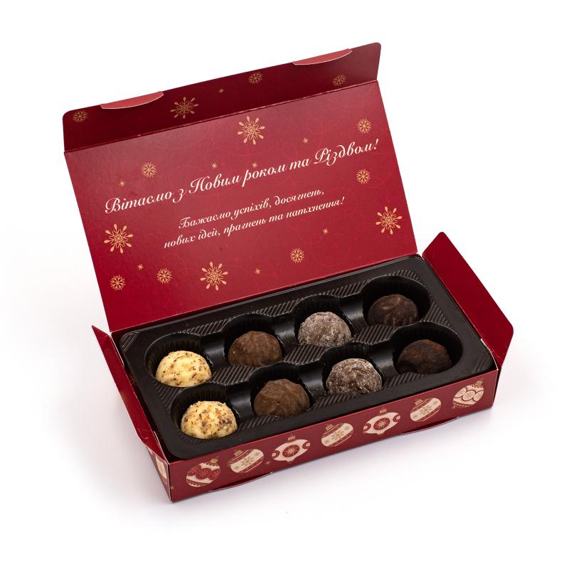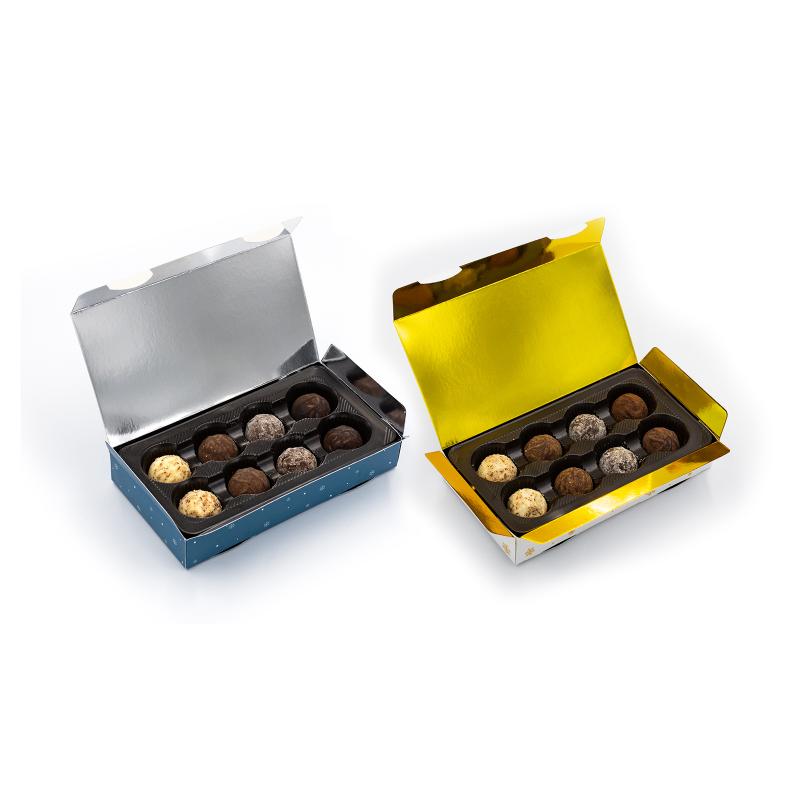 Преміальна коробка з французькими трюфелями в шоколаді — ідеальний подарунок чи корпоративний сувенір. Оформлення доступне в трьох варіантах: односторонній друк, двосторонній друк або преміум золото/срібло. Повнокольоровий друк на міцному картоні 230 г з матовим або глянцевим ламінуванням надає упаковці стильного вигляду. Вишуканий смак і презентабельний дизайн поєднуються у форматі 170 × 92 × 27 мм, створюючи враження преміум-класу. Тип упаковки: книга.