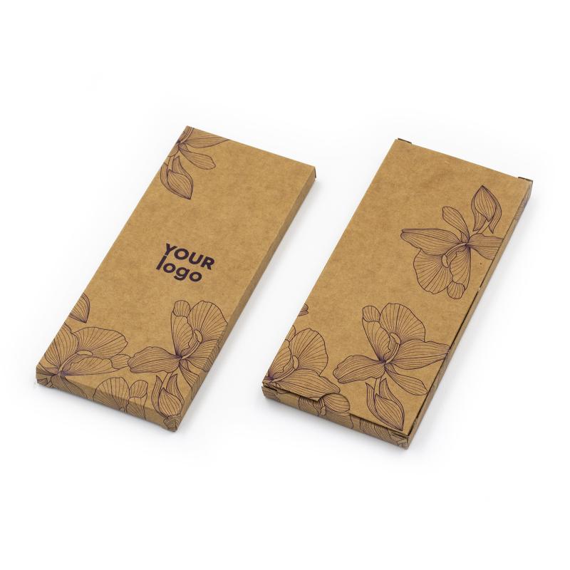 Шоколадна плитка вагою 85 г, упакована в крафтовий картон, доступна в молочному та темному варіантах. Ідеальна для брендингу, з можливістю повнокольорового друку та індивідуального пакування в золоту або срібну фольгу. Термін зберігання - 12 місяців, виробництво займає від 5 до 14 робочих днів.