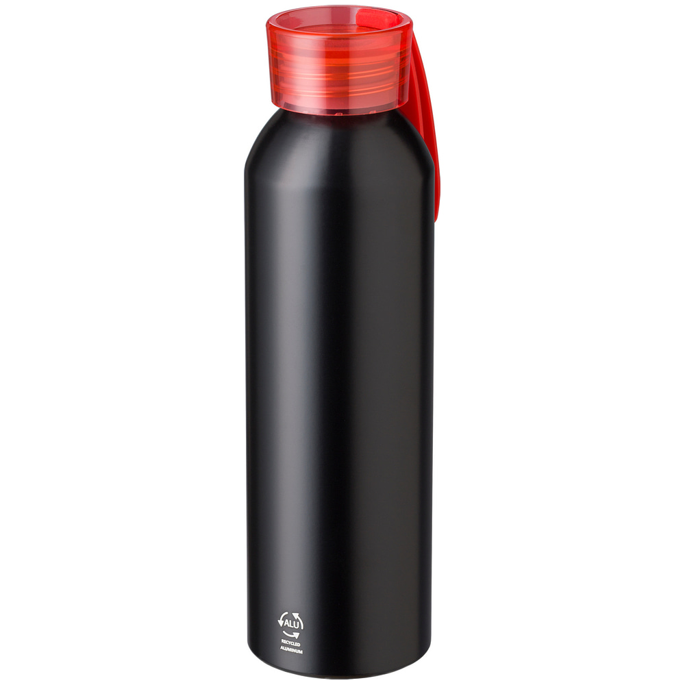 Бутылка в матовом алюминиевом корпусе. Оснащена прозрачной крышкой из полистирола и силиконовой лентой для удобства переноса. Удобный аксессуар для спорта и отдыха. Внизу на корпусе выгравирован логотип переработанного алюминия.
