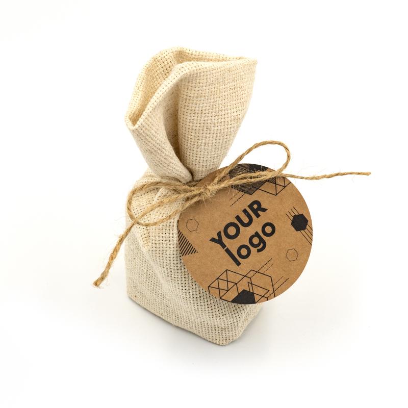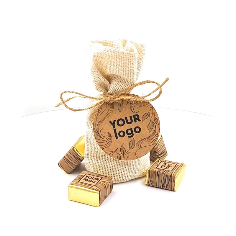 Джутовый мешочек (46, 65, 66 г) с логотипом крафт – это стильный и естественный выбор для корпоративных подарков. Его наполняют разнообразными вкусностями, в частности, шоколадными конфетами или драже, весом 46, 65 или 66 граммов. Благодаря использованию натурального джута такая упаковка выглядит экологично и привлекательно, а также поддерживает тренд на экологические и удобные упаковки.
