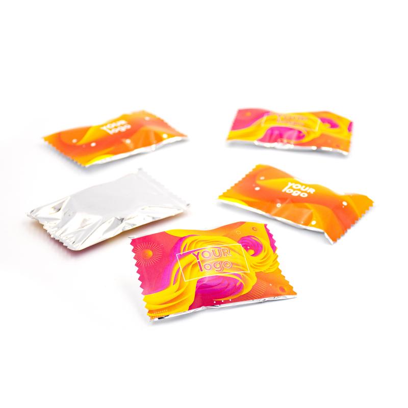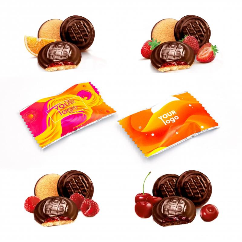 Печенье "Lovita Jelly" с логотипом (15 г) – брендированное бисквитное печенье с разными вкусами желе (вишневое, малиновое, апельсиновое или клубничное) в шоколаде. Упакованное в полипропиленовую пленку с цветным логотипом, печенье подходит для рекламы на разных мероприятиях. Размер – 71 х 62 мм, срок годности – 12 месяцев.