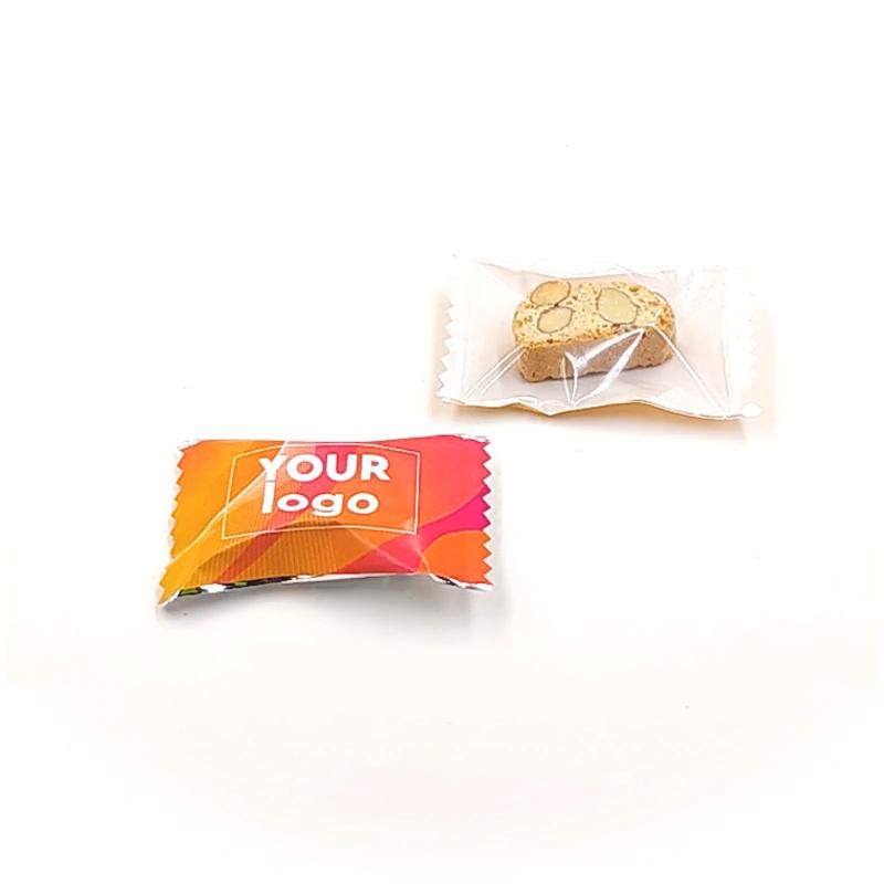 Печенье "Сantuccini" с логотипом (4,5 г) – это брендированная закуска с вариантами вкусов: клюква с шоколадом, ореховый микс, миндаль, клюква, шоколад с фундуком. Печенье упаковано в полипропиленовую плёнку с возможностью выбора прозрачной, металлической или жемчужной упаковки, на которой размещают логотип. Размер упаковки составляет 66 x 45 мм, а срок годности – 9 месяцев.
