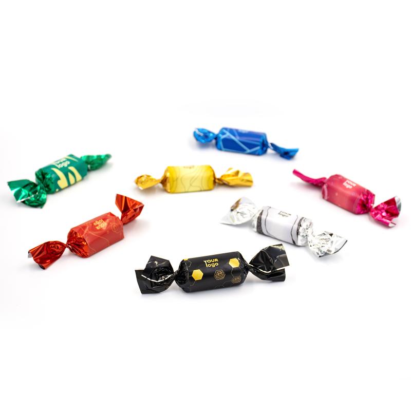 - Упаковка: яскрава твіст плівка (золотий, срібний, рожевий, чорний, червоний, синій або зелений) з повнокольоровим логотипом на самоклеючому папері